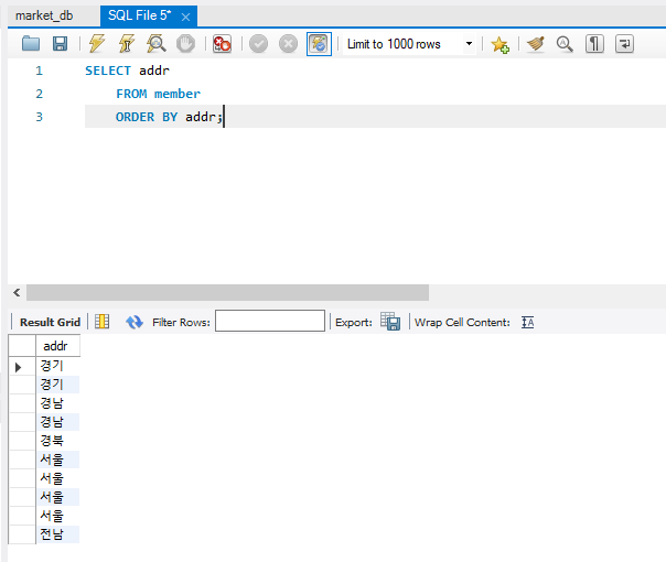위 코드에서 DISTINCT를 사용했을 경우 중복된 데이터 1개만 남아있는것을 알수 있습니다.