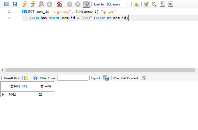 위 코드에서 MMU가 몇개를 구매했는지 GROUP BY 와 SUM()을 사용하여 알아보겠습니다.