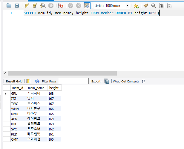 - ASC는 Ascending의 약자로 오름차순을 뜻합니다.
