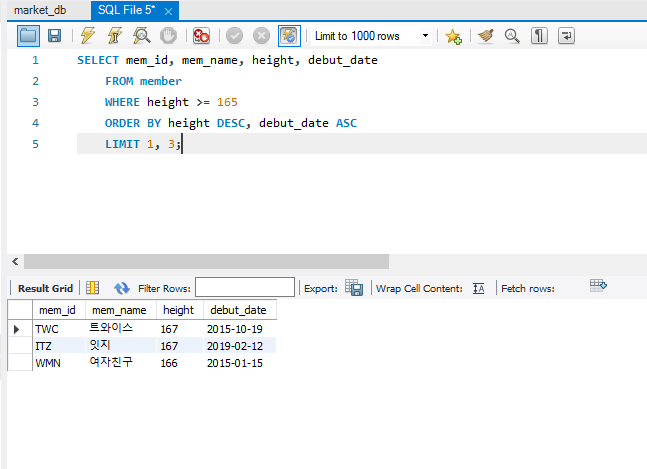 - 예시로 LIMT 1, 3 하시면 1번째 부터 3개만 입니다. (0번째 부터 시작입니다.)