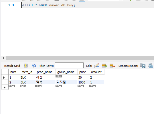 INSERT INTO buy VALUES(NULL, 'BLK','지갑', NULL, 30, 2);