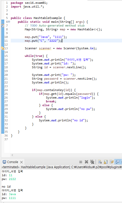 예시) 키보드로 아이디와 비밀번호를 입력받아서 저장되어 있는 키와 값을 비교한 후 로그인 여부를 출력하는 예시