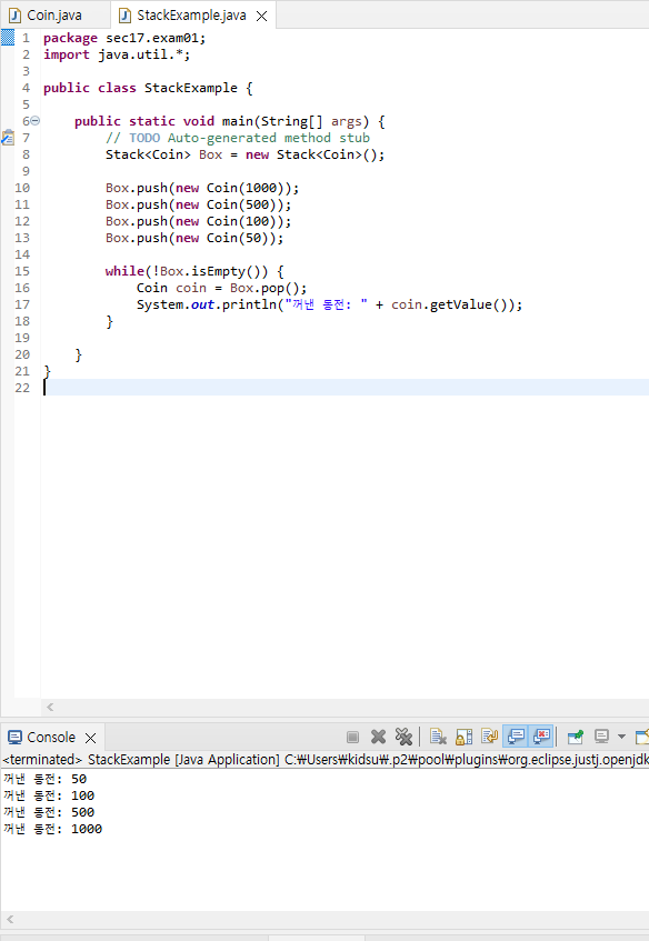 System.out.println("꺼낸 동전: " + coin.getValue());