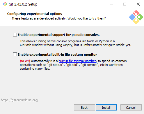 마지막으로 실험적 기능을 사용 할것인지에 대한 창입니다.