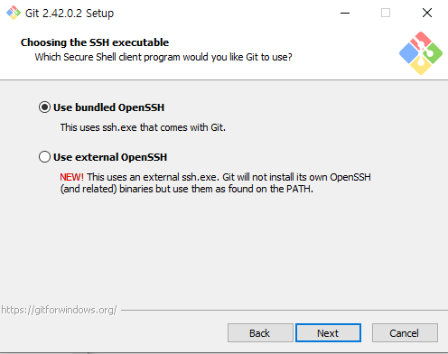 Use bundled OpenSSH는 Git에 기본으로 포함되어 있는 OpenSSH를 사용한다는 것입니다.