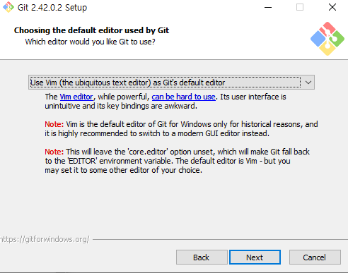 Git의 기본 편집기를 선택해주는 창입니다. (각자 하고싶은대로 설정해주시면 됩니다.)