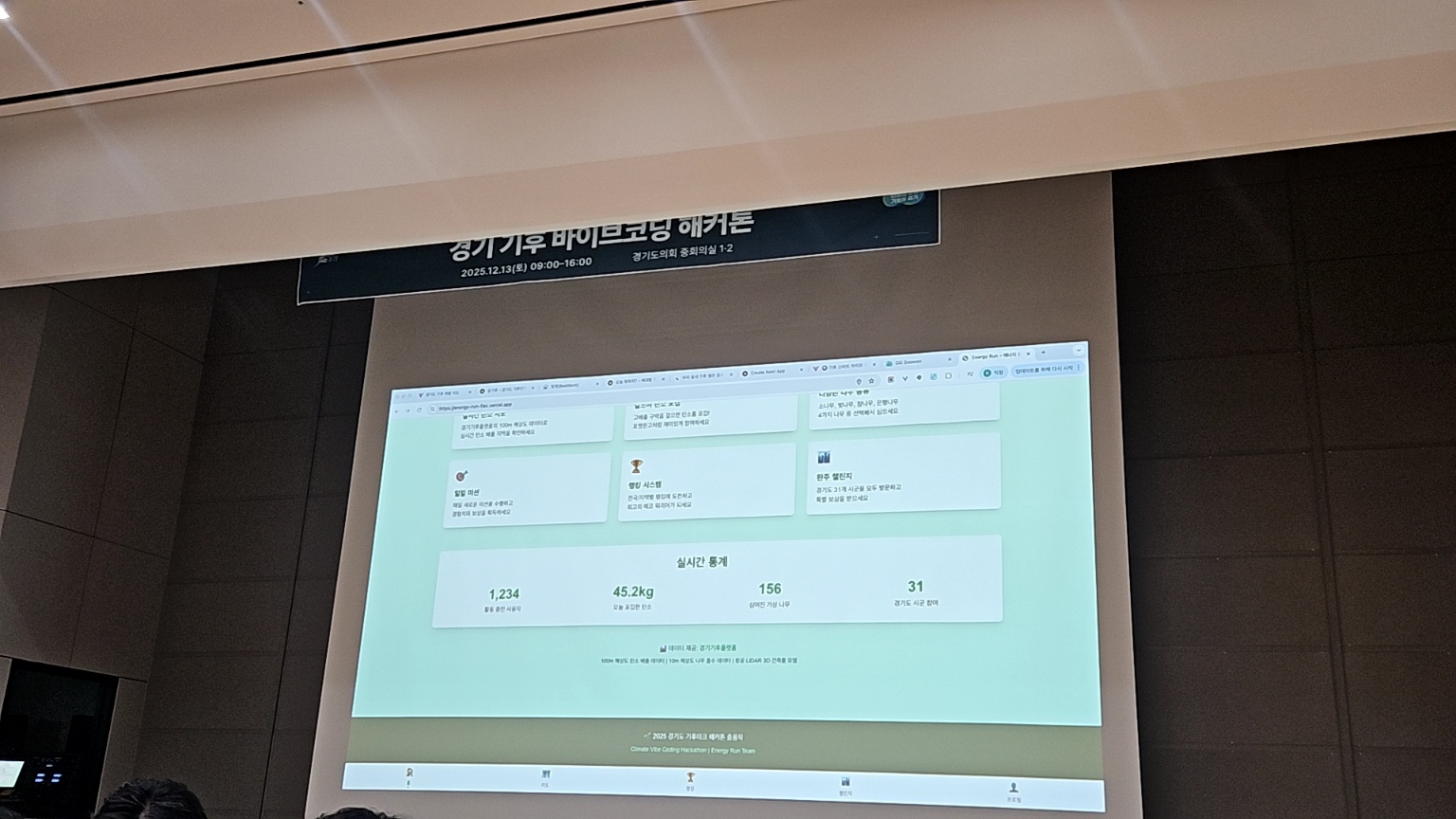 12월 13일, 경기 기후 바이브코딩 해커톤을 팀원 한 명과 2인 팀으로 참여했습니다.