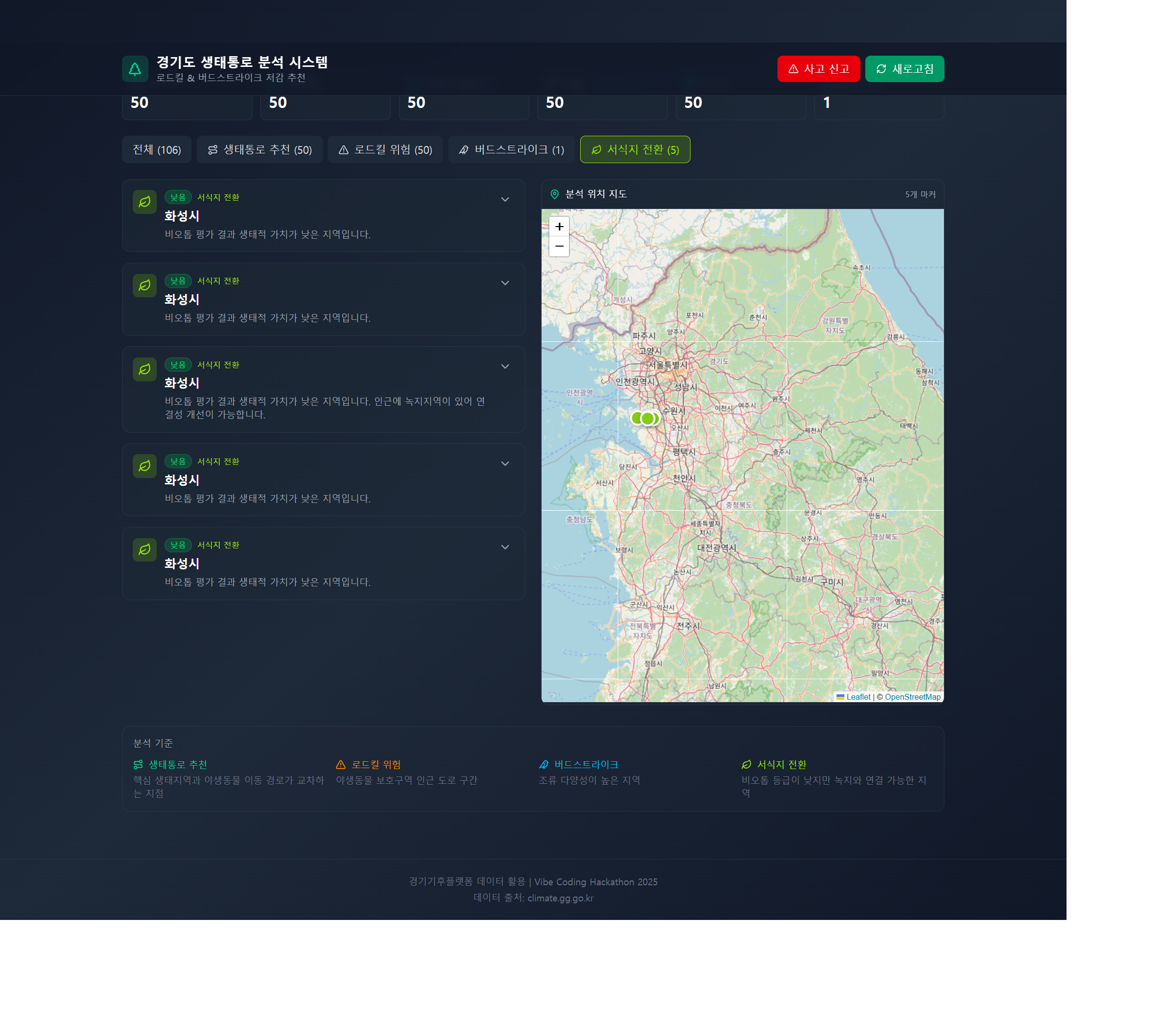 경기기후플랫폼에서 제공하는 공간 데이터로 생태통로 설치 우선 지점과 서식지 전환이 필요한 위험 지역을 도출하고, 분석 결과를 지도 기반으로 시각화 하였습니다.